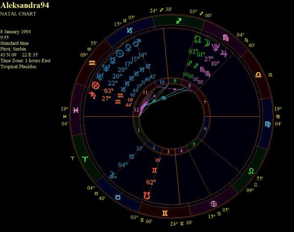 Venera je u povratku u svojoj egzaltaciji pa Aleksandra mora da se čuva velikog zaljubljivanja, naročito ako joj se nudi tajna ljubavna veza (ta je Venera u 8 pa u konjunkciji sa Neptunom što je tajna ali i obmana) pa bi mogla doći u situaciju da zavisi od nečije volje. Ovo generalno nije dobar period za ljubav za nju već za posao, da se dobro namuči u poslu, oko traženja posla ili napredovanja u poslu, da uči i stiče nova znanja. Samo će na taj način ublažiti negativne efekte dolazećeg Saturnovog povratka a naročito po pitanju psihe i mogućih naslednih bolesti na moju veliku žalost.